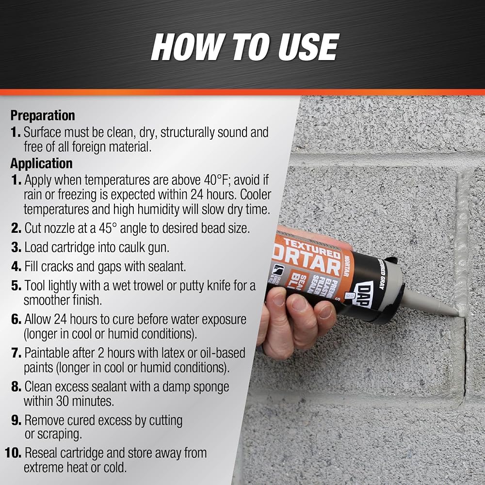 DAP Textured Mortar is a Premium Elastomeric Filler and Sealant filler and sealant used to repair and seal cracks and joints in mortar, masonry, stucco, concrete, stone, and brick. The textured finish blends easily with most mortar substrates for a seamless finish. Features excellent flexibility, adhesion, and durability to provide a long-lasting crackproof seal. Ready to use with no mixing required. Easy water cleanup and low odor. DAP Textured Mortar will not stain or bleed onto the application surface. DAP caulk and sealants provide durable performance for a variety of projects. Exterior and Interior Use.