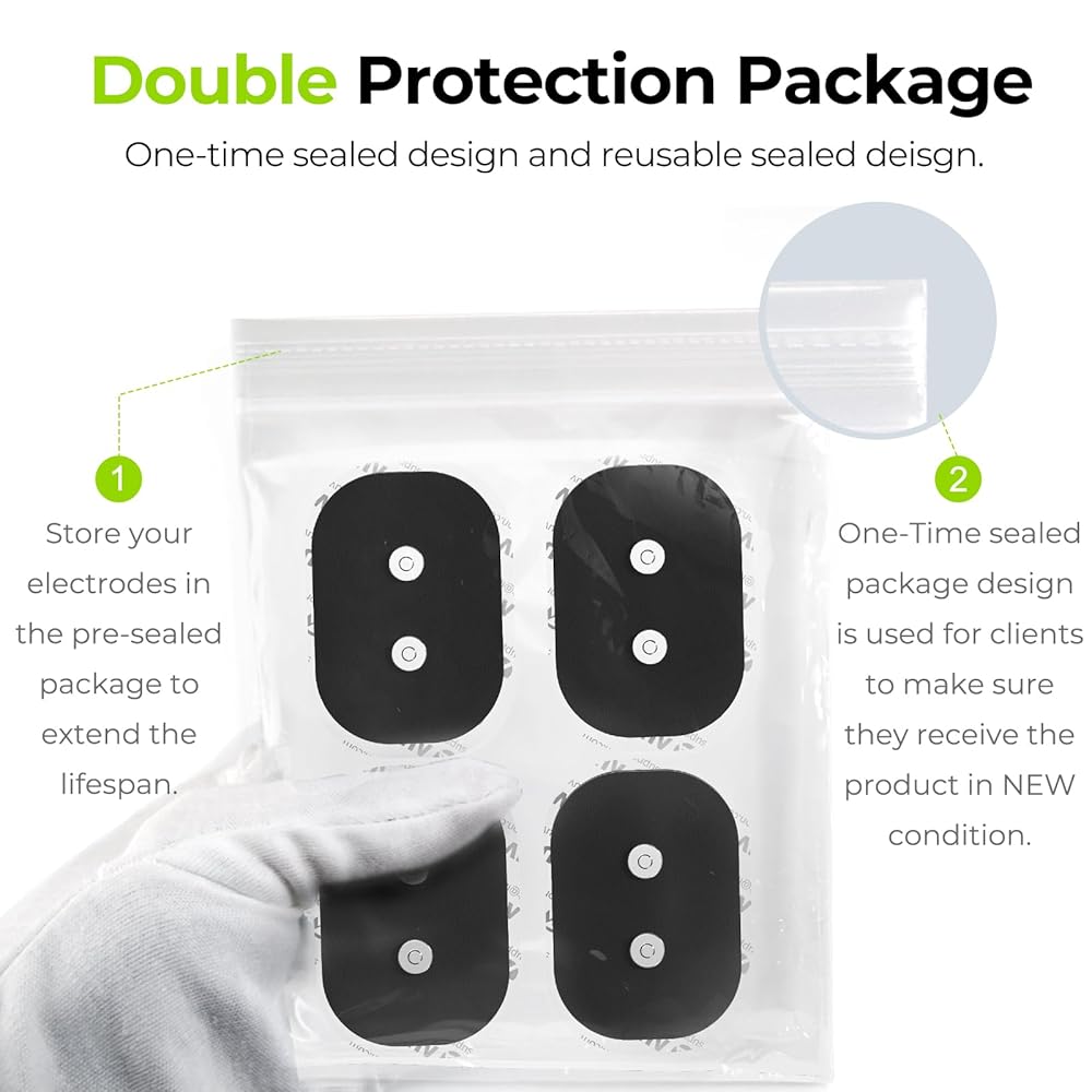 12 Packs in 2 Sizes for Personalized Pain Relief Options: This 12-pack set includes two different sizes of TENS electrode pads. You can use the large pads(2.2" x 5.1") to enjoy relief on the legs, waist, and back, and the small-size TENS pads (2.4" x 1.7") target more localized pain, such as on the neck, knees, and shoulders