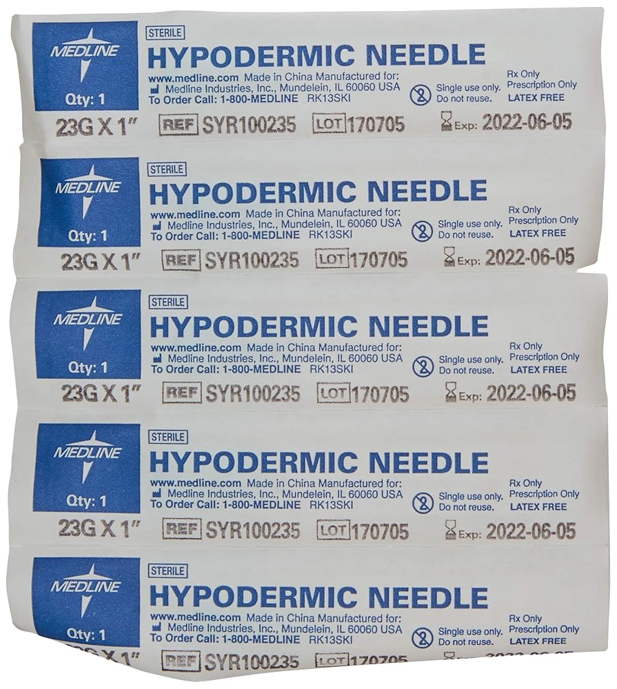 Introducing the Standard Hypodermic Needle, featuring a regular bevel designed for a variety of applications, these 23G x 1-Inch needles are crafted for reliability and precision. Packaged in a box of 100 each, these needles are ideal for medical professionals who require consistent performance. Please note that syringes are not included with this product.