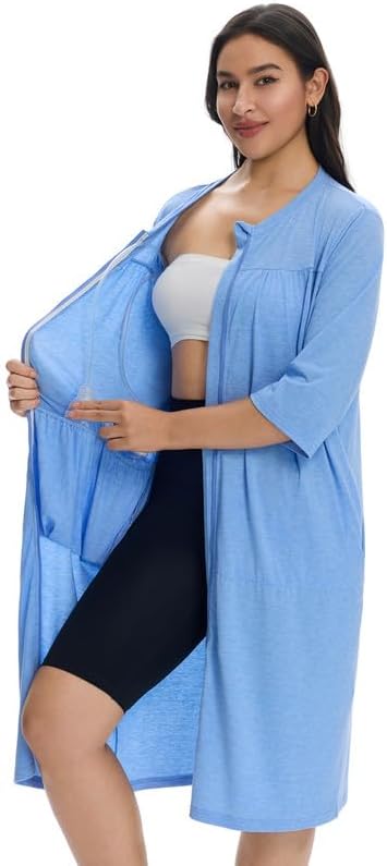 Thoughtful Recovery Features: Front zipper closure makes dressing easier after surgery. 3/4 length sleeves ensure gentle coverage without interfering with medical access.