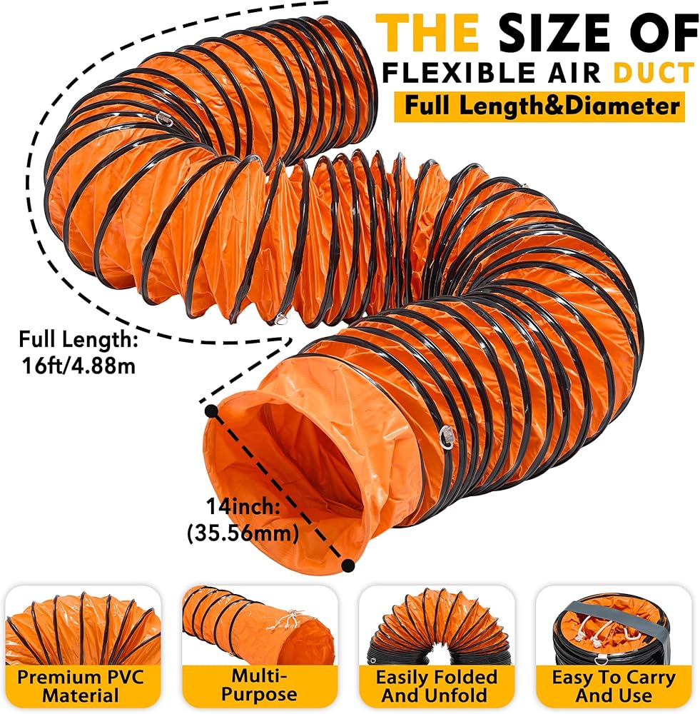 【Flexible PVC Ducting】Diameter wide: 8in (20.32cm), Length: 16feet (4.88 meter), Temperature Range: -22°F~212°F (-30℃ to 100℃), PVC flexible duct applied hard-wearing, flexible vinyl woven polyester with carbon wire spring and adhesive tape, smooth inside wall. Designed to be super flexible and flame-retardant, easy for storage.