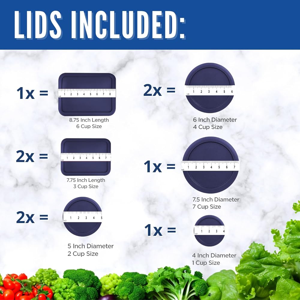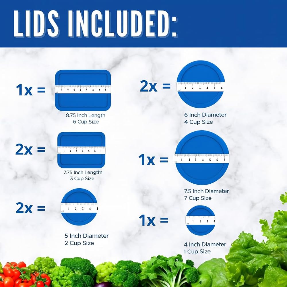 9 PC SET BLUE: Includes lids for Pyrex - (1) 1-Cup (7202-PC), (2) 2-Cup (7200-PC), (2) 4-Cup (7201-PC), (1) 6/7-Cup (7402-PC), (2) 3-Cup (7210-PC), and (1) 6-Cup (7211-PC)