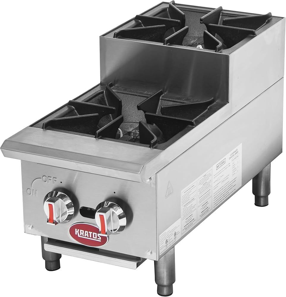 With its compact design and highly durable stainless steel construction, the Kratos 29R-002 12" Step-Up Countertop Range/Hot Plate with Two Burners is the ideal solution for your busy kitchen. This unit features two powerful 30,000 BTU burners with independent controls, enabling you to cook up two different menu items simultaneously for added efficiency. The heavy-duty cast iron grates are removable for easy cleaning. Additionally, the 29R-002 features a removable grease tray, ensuring fast cleanup. This natural gas hot plate can be field converted to liquid propane by a qualified service technician and features a 3/4” rear gas connection. Its step-up design enhances overall efficiency and is perfect for tight spaces in diners, food trucks, restaurants, and more!