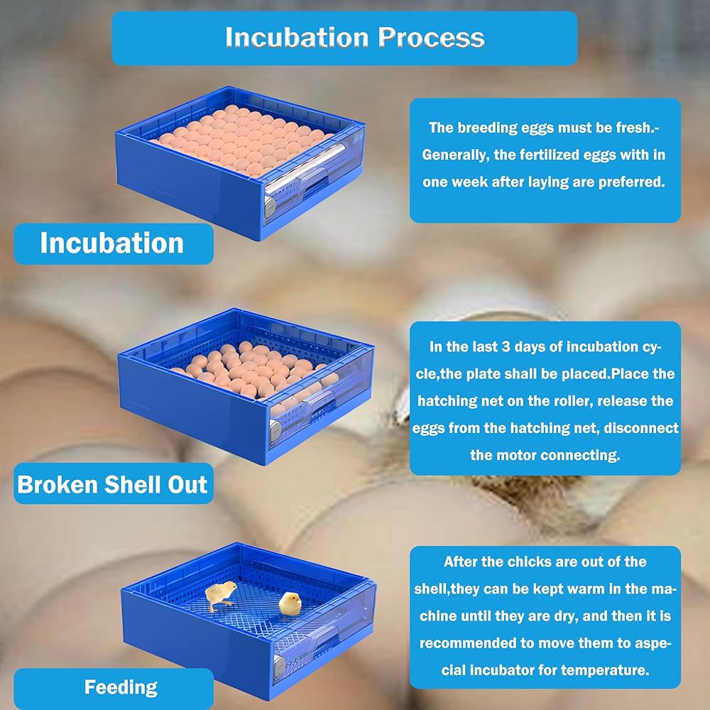 • 🐣【Automatic Egg Flipping】 The machine adopts one-piece drive shaft design, turning the eggs automatically every 2 hours, without the need for manual work, so that the eggs can always be heated evenly.