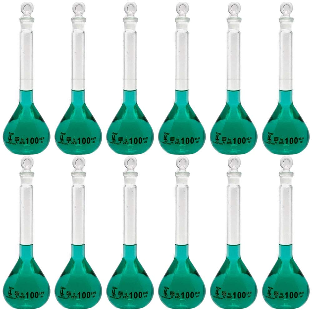 Karter Scientific Class A Volumetric Flasks are manufactured from high quality inert 3.3 borosilicate glass and meet the tolerances requirements as established by ASTM E-694 - ASTM E-542 - and ASTM E-288. Flat bottom. Volumetric flasks provide improved lab convenience, broad selection and precise volume measurement. Accuracy limits conforms to ISO 1042 Laboratory Glassware-One mark volumetric flasks. With one permanent circular mark. Printed with fused-on enamel color, resistant to most acid and alkaline solutions. Calibration is based on the poured in volume ("In") at a +20°C reference temperature.