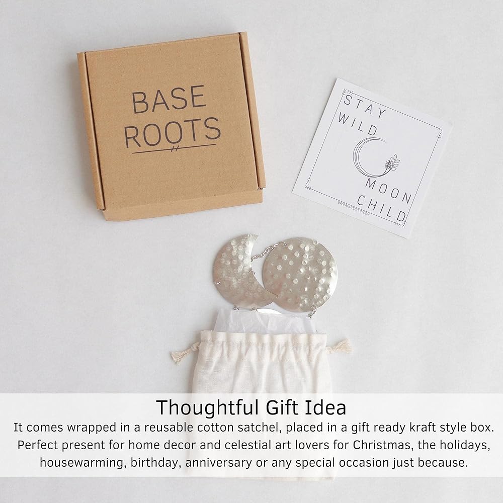 Made with hand-hammered gold metal moons and delicate chains, each is unique and original. Any slight marks add to the patina. Textured details will sparkle in shining light and chime with the wind
