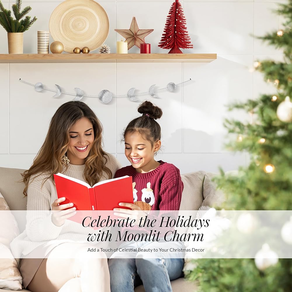 Garland has 13 moons pictured horizontally, length 36", each crescent is 2.25" hanging down 2" to 4"; Links could be added to extend the length. Lightweight and ready to hang (hardware not included)