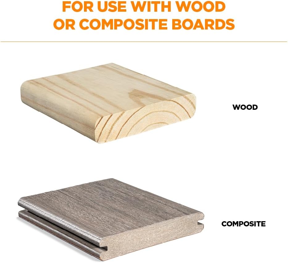 CAMO MARKSMAN Pro-X1 Kit, Deck Tool, 700 Edge Screws & Bits, Edge Fastening Installation, 1/16" Spacing, Fits 5-1/4-5-3/4" Wood DeckingThe CAMO Edge Deck Fastening System is a fast, easy, and affordable way to install a fastener-free deck surface. Patented CAMO Edge Deck Screws have a rake tip that augers material out as you drive. The Pro-X1 Guide allows you to quickly install these screws through the edge of the deck board—not the surface. To use the Pro-X1 Guide, attach the driver bit (included with CAMO Edge Deck Screws) to your drill, load Edge Deck Screws on both sides of the Guide, and drive. It's that easy! The built-in shoulder on the driver bit sets an automatic depth of drive which prevents over-driving the screw. The Pro-X1 Guide is ideal for treated lumber. It fits any 5-1/4 in. (133mm) to 5-3/4 in. (146mm) deck board and creates an automatic 1/16 in. (1.58mm) spacing which is perfect for the typical shrinkage that occurs in treated lumber. Hide your deck screws with the CAMO MARKSMAN system. Edge fasteners are hidden deck screws designed for any wood or composite board in a square or grooved profile. Some of the most common deck tops any board type including square or grooved composite, pressure-treated wood, PVC, or hardwoods,. Edge hidden deck screws are the best way to enjoy the beauty of your deck top without seeing your fasteners. Edge hidden deck screws are installed on the edge of the deck board, hiding the fastener while protecting the face of the deck board. The rake tip design of the screw augers material as it is driven, leaving you with a fastener free deck surface that is less prone to splitting and cracking. Not only does this system improve the overall look of your deck, but it holds stronger than a traditional face fastener. When a deck board is face fastened, the head of the screw or nail is keeping your board in place. Edge hidden deck screws leverage the strength of the entire screw to hold your deck board in place. Available in PROTECH exterior coating and 316 stainless steel.