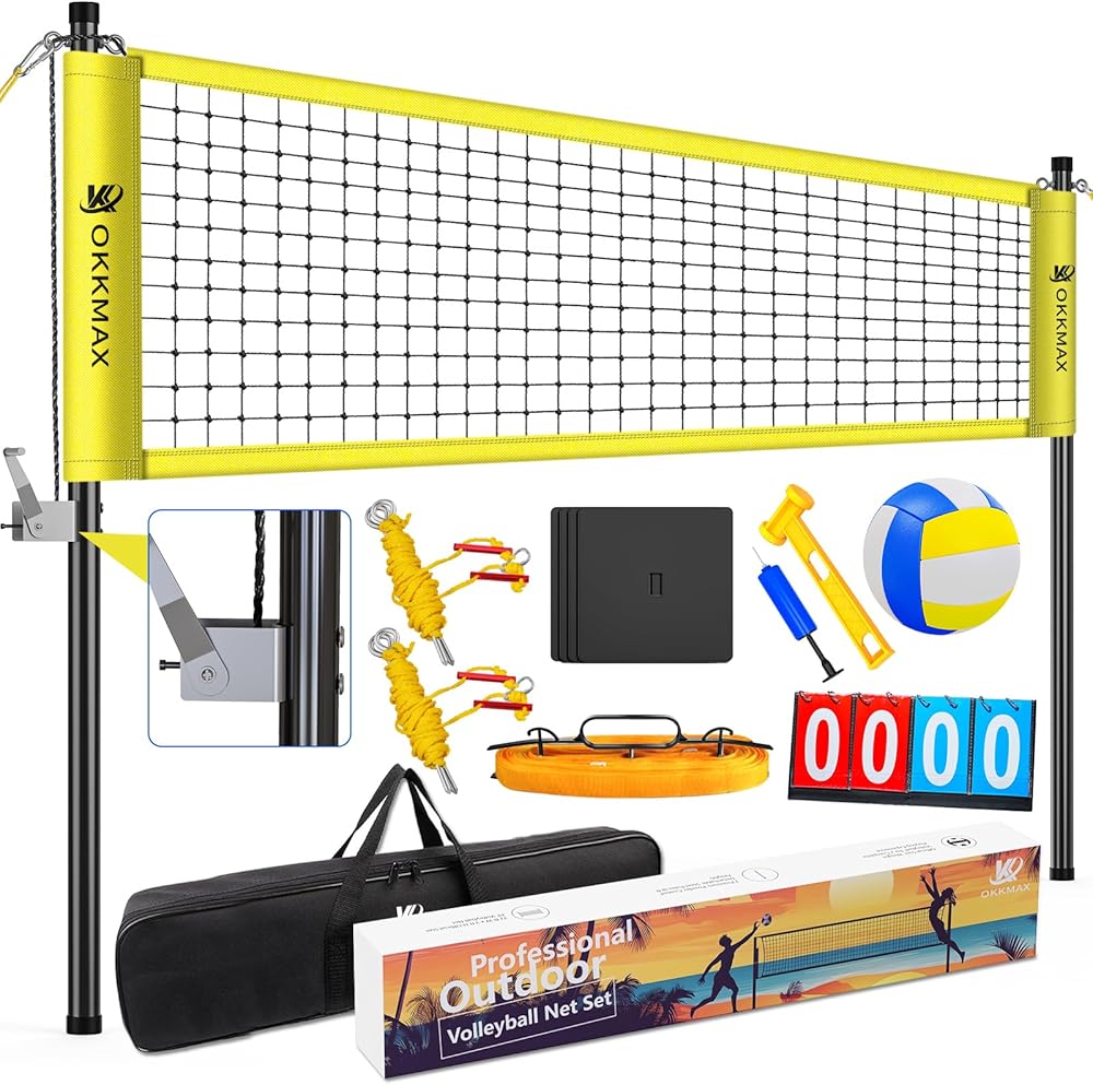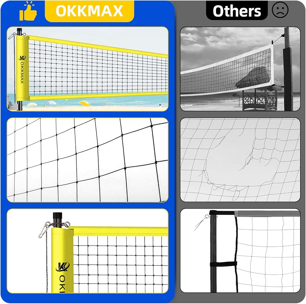 【Package】OKKMAX heavy duty volleyball net includes 1 volleyball net(32'L x 3'H) , 1 PU volleyball and ball pump with pins, 6 poles, 2 guide ropes with 4 metal stakes, 4 beach fixing plates, 4 boundary lines with 4 U-pegs, 1 spool for boundary line, 1 scoreboard, 1 hammer, 1 sport carry bag.