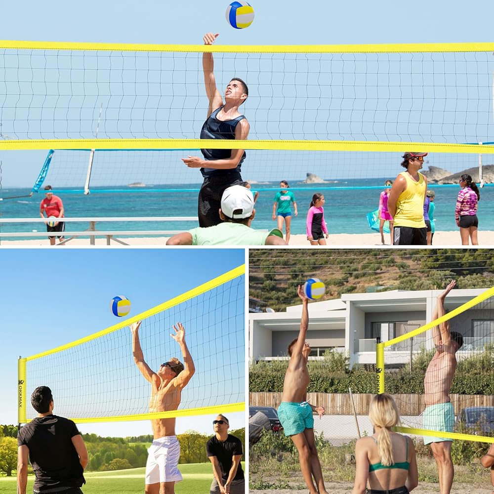 【Heavy-Duty Volleyball Net Set】Our volleyball net for backyard (32'Lx3'H) is made of double-layer oxford fabric with 4'' side sleeves, 2'' top and bottom ties, volleyball net is reinforced with triangles at all four corners, 4-inch PE netting rope with thickened cords, sturdy and tear-resistant. The edges of the volleyball net are made of waterproof material to withstand the sun, rain and other outdoor elements.