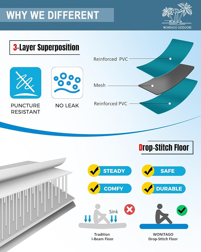ENJOY COMFORT JOURNEY --- This inflatable travel kayak's drop-stitch floor can provide better support and flat surface than I-beam floor, providing better support for your waist. It's ideal for excursion along the river to enjoy the scenery