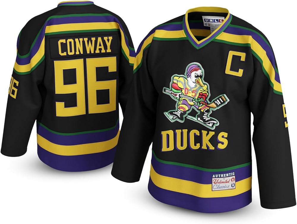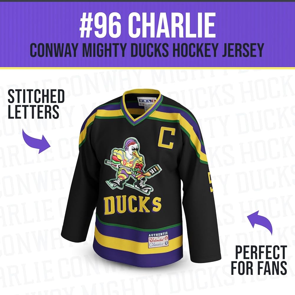 AUTHENTIC MOVIE DESIGN FOR SPORTS FANS: This Charlie #96 Conway Ducks Hockey Jersey is the perfect choice for any movie buff or sports fan. Professionally stitched letters and numbers provide an authentic look, making it ideal for costumes, fan events, or everyday wear.