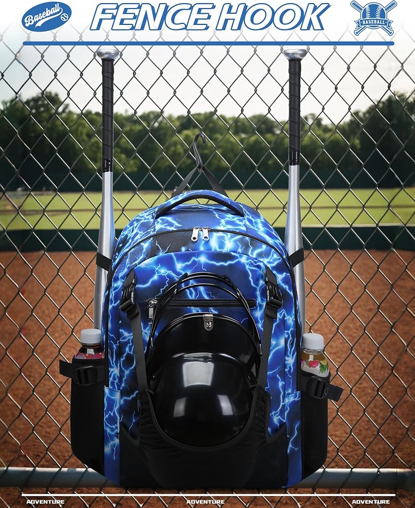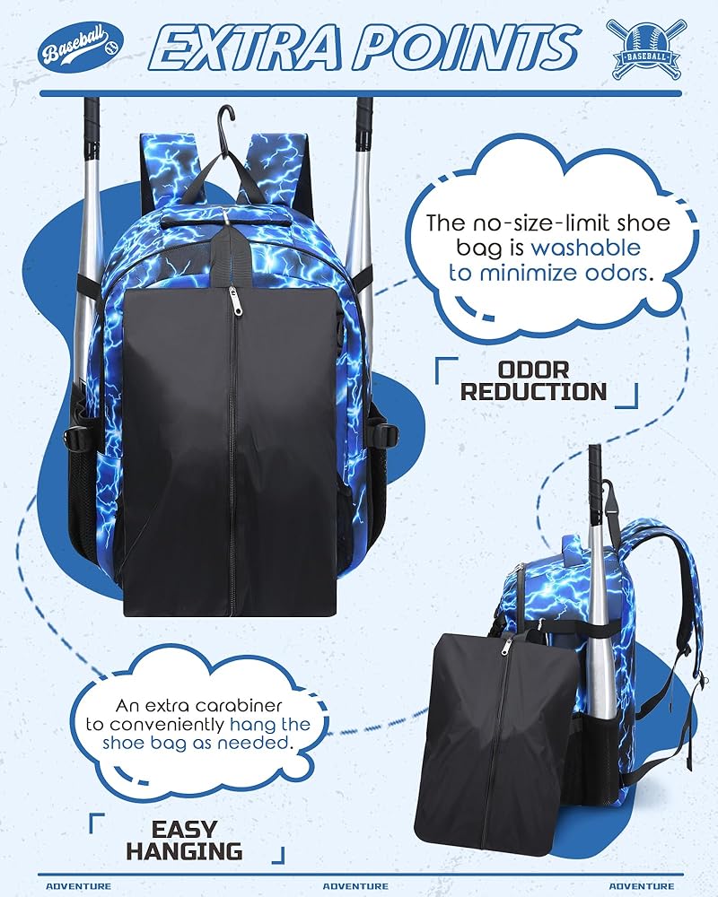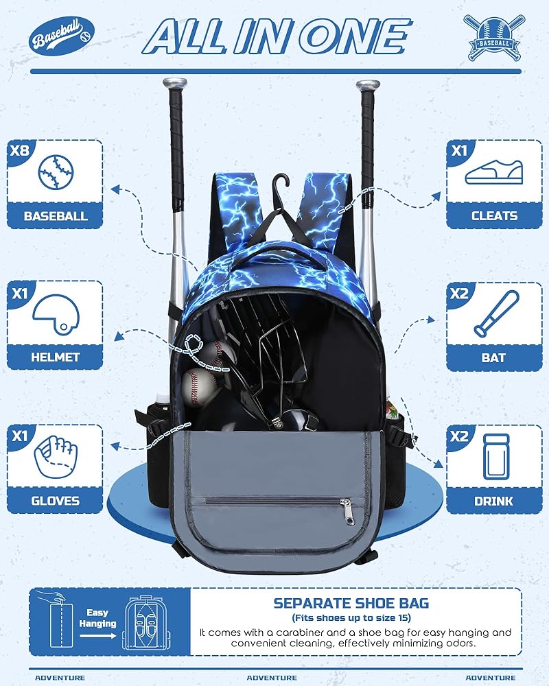 This bag is roomy enough for all your baseball or softball gear like helmets, cleats, bats, gloves, clothes and other personal items. The separate shoe bag fits shoes up to size 15 and is easy to clean separately for hygiene. The adjustable mesh helmet holder is also ideal for carrying sports balls like basketballs or soccer balls. With extra pockets, smooth zippers, padded and mesh-lined S-shaped straps, this bag is both practical for organization and comfortable for everyday use or travel.