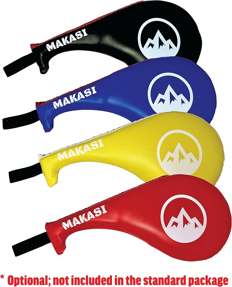 For an additional price, a Taekwondo kicking pad with thick double pads or a groin cup can be added to this set. Kicking pads in the picture with the red asterisk are not included in the standard set.