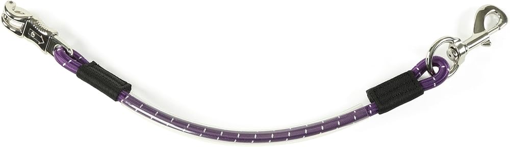 Shires Heavy Duty Bungee Trailer Tie. This calming, shock absorbing robust bungee line quickly tethers the horse in the stable, yard or trailer or two can be used to safely cross tie a familiarised horse. If the horse pulls, the bungee line offers gentle resistance which reduces stress. Featuring a swivel trigger clip at one end with a panic clip that attaches to the headcollar and allows the handler to quickly intervene by pulling down on the clip. The polyester bungee is encased in a clear plastic tube to reduce wear and tear. Total unstretched length 62cm.