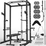 Multi-Functional Power Rack Cage Pulley System Home Gym Equipment with J-Hooks, Dip Handles, Landmine Attachment