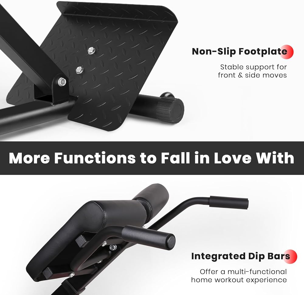 Dip Bars: The ideal tool for exercising the chest and triceps is dip bars. Incline push-ups and hanging dip add challenge and enjoyment to your daily Roman Chair workouts. The integrated design makes adjusting and transitioning between different exercise positions simple and efficient. With this multifunctional tool, meet your specific needs and fitness goals, helping you sculpt a strong and well-defined upper body