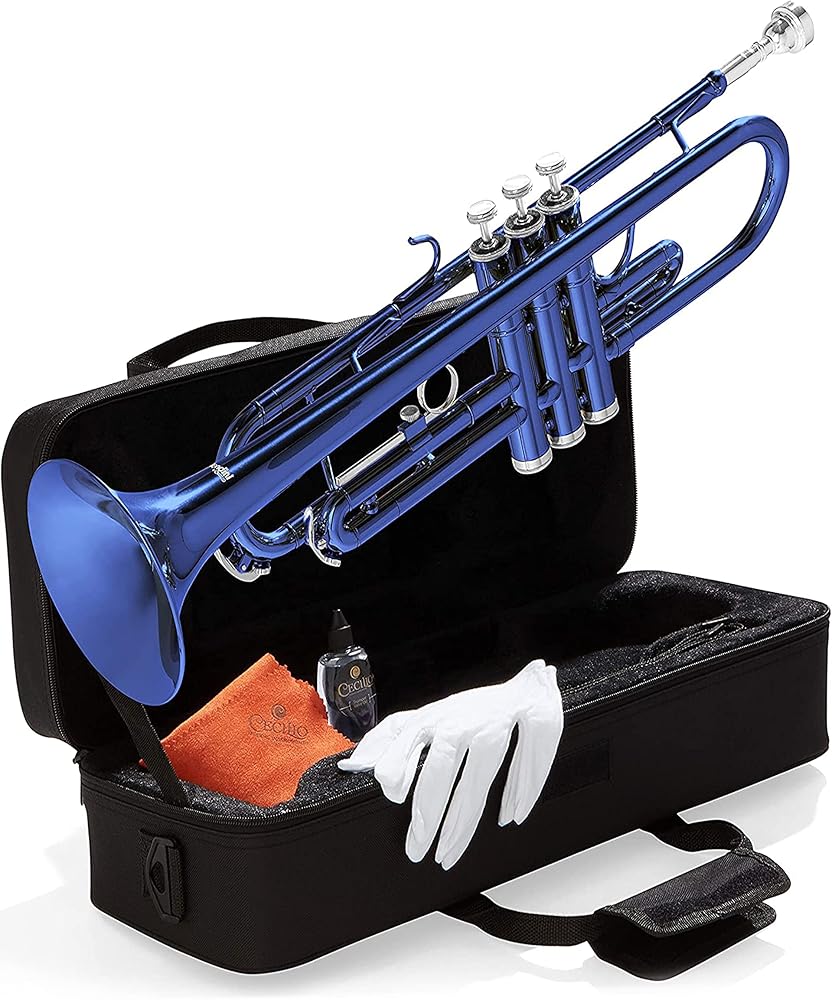 Mendini By Cecilio Bb Standard Trumpet Set for Beginners - Brass Trumpet Instrument with Hard Case, 7C Mouthpiece, Valve Oil, Cleaning Cloth, Gloves (Blue)
