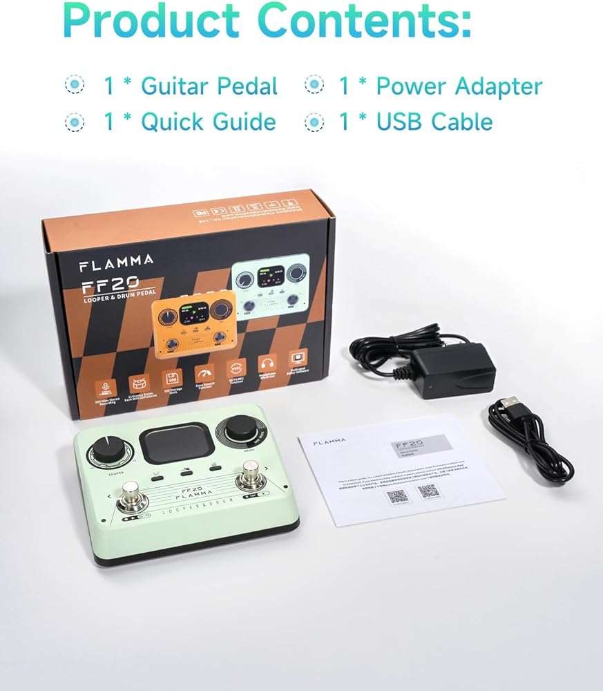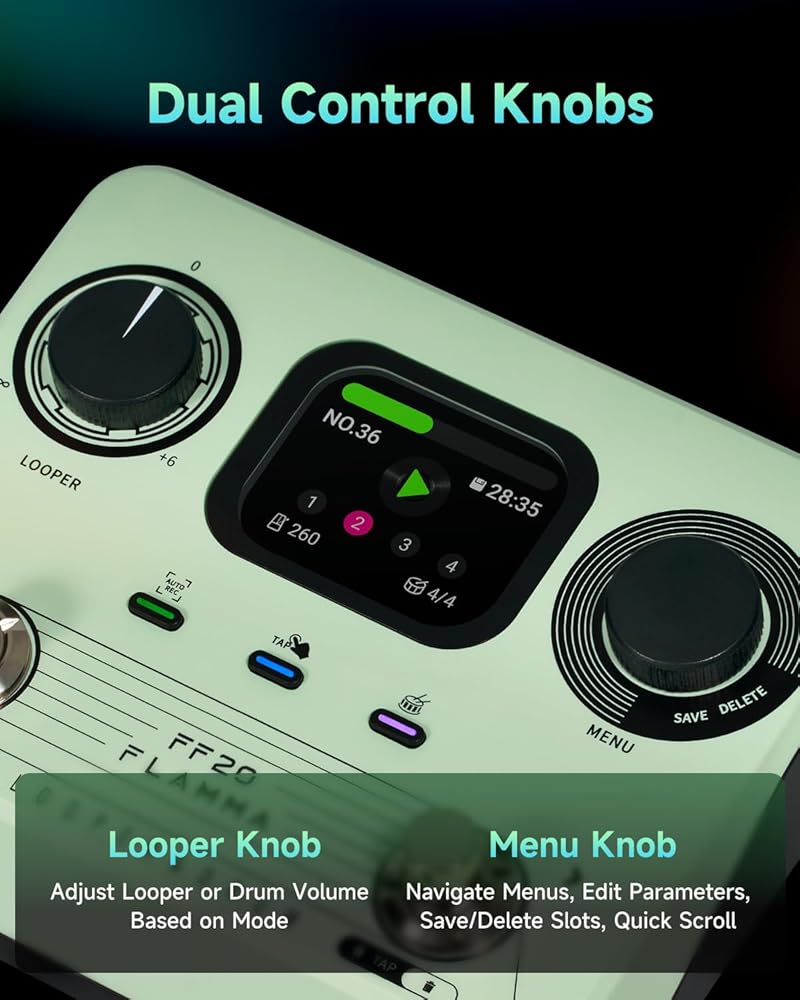 FLAMMA FF20 Looper Pedal Drum Machine, Drum Looper Guitar Pedal with Screen, 300 Min Recording, 220 Drum Grooves, 100 Loop Slots, Time Stretch, Auto Record, USB & Headphone Out, for Guitar and Bass