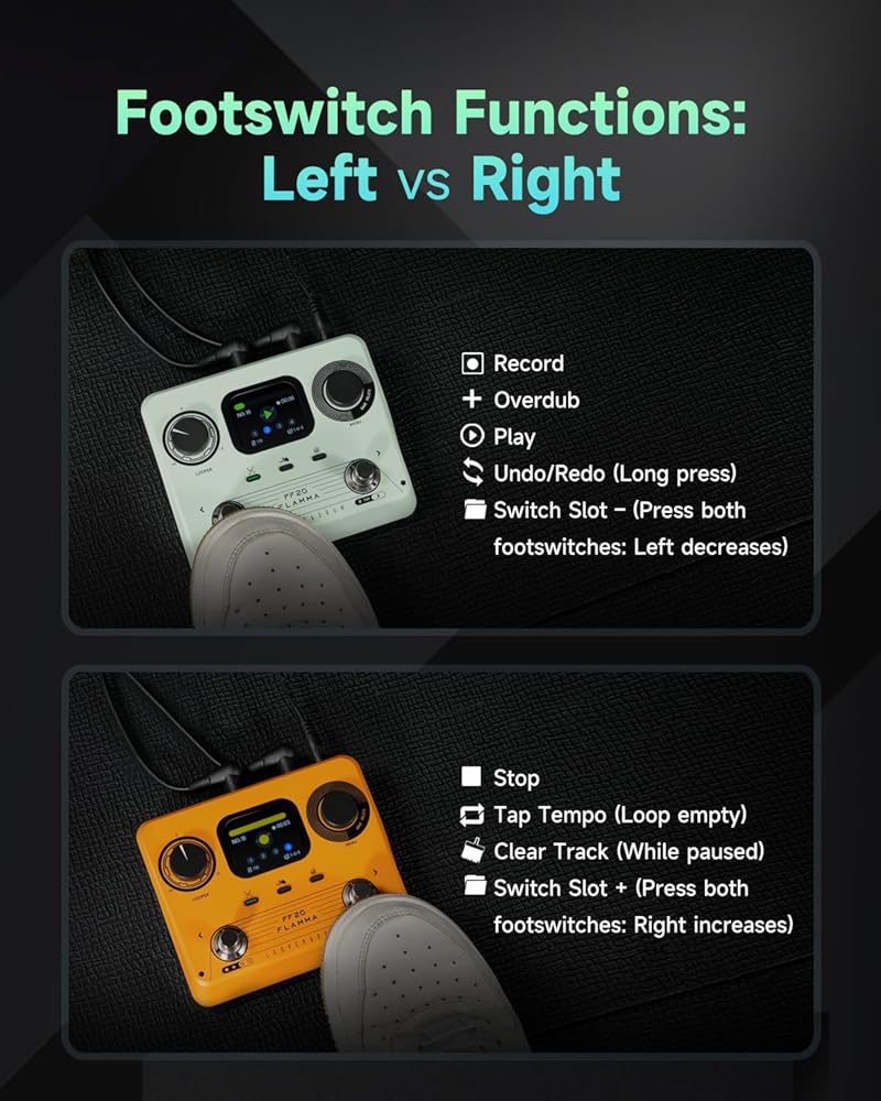 Dual Footswitch Stereo Looper Pedal: This stereo looper pedal features dual footswitches for intuitive control—record, overdub, play, stop, and switch loops easily, whether you're on stage, in the studio, or practicing at home