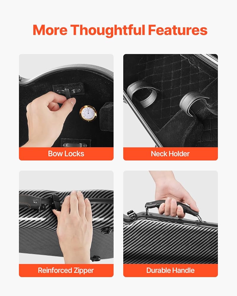 Precision-Engineered Structure: This violin case includes a built-in hygrometer to monitor humidity and reduce the risk of wood cracking or warping. Bow holders have locking slots, with explosion-proof zippers and a reinforced handle for lasting use