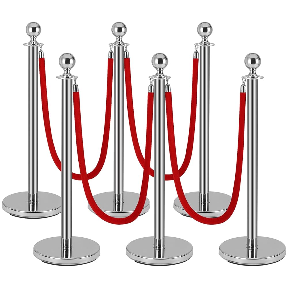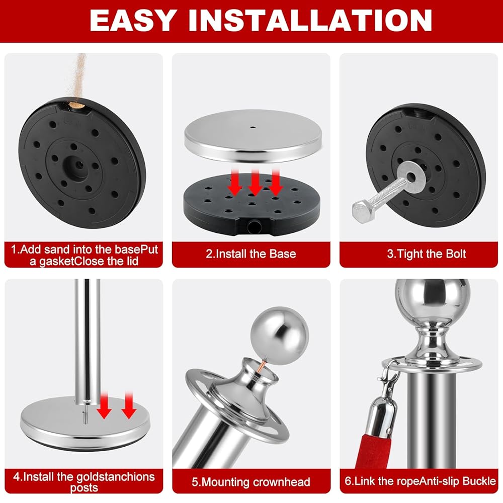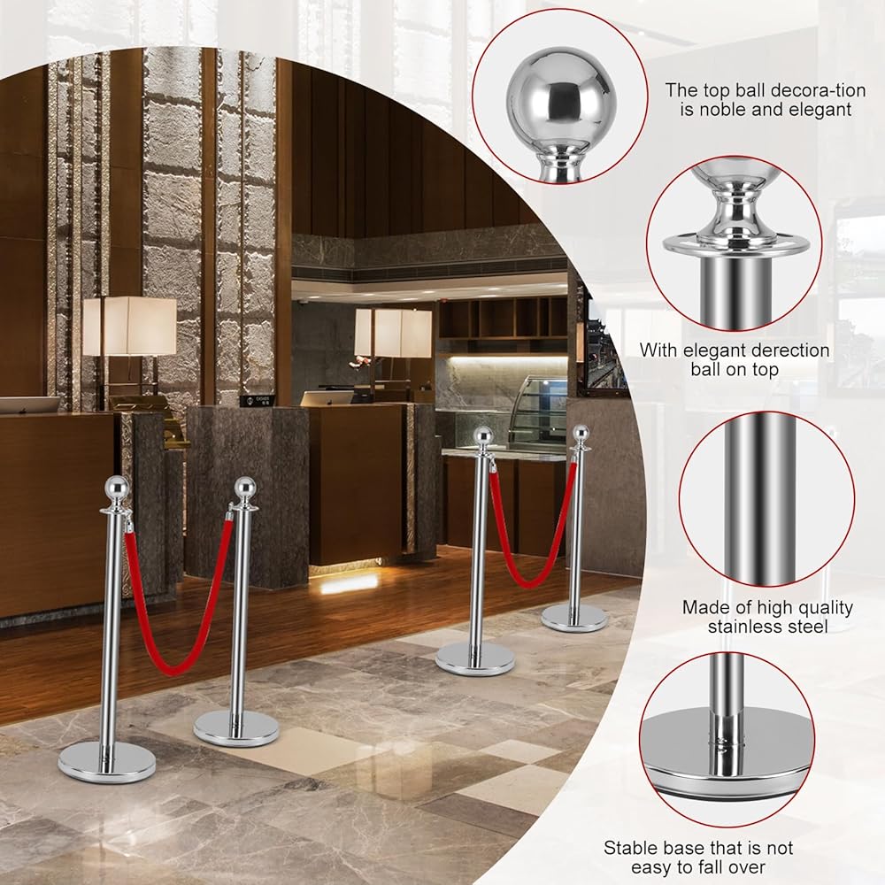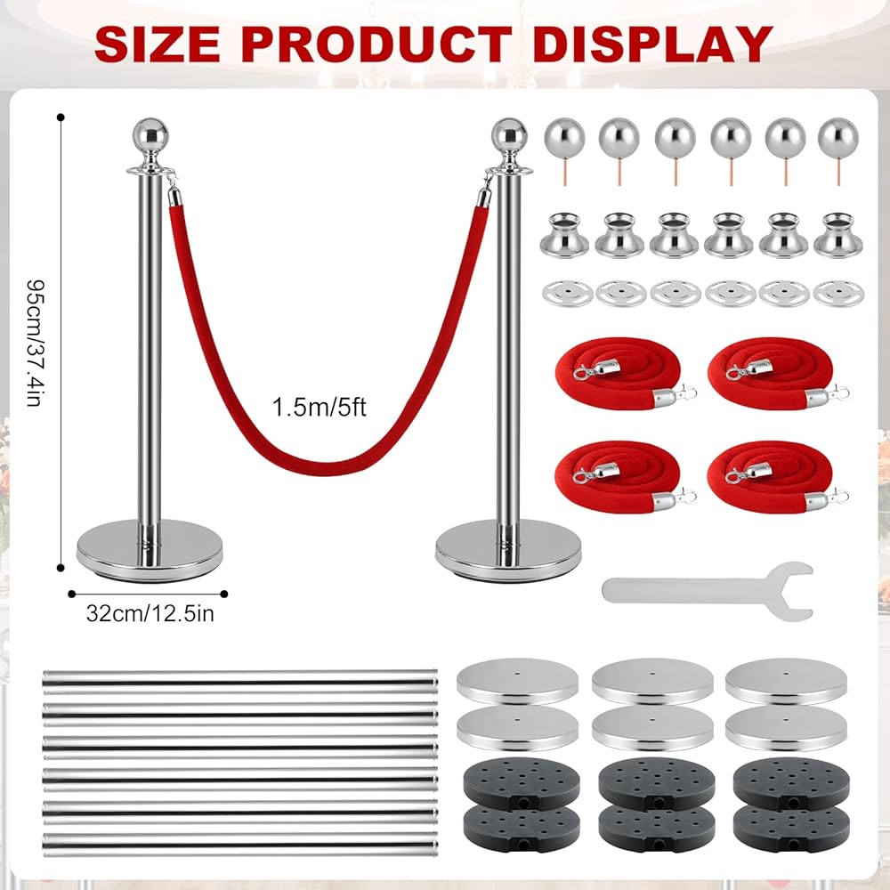 Easy to Install: You can quickly and easily assemble red carpet poles and ropes set, Each post effortlessly screws into place, ensuring a hassle-free setup process, and each post has 4 adapters on top for attaching velvet ropes, and there are hooks at the ends of each rope.