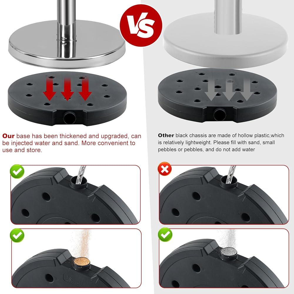 Leak-proof Fillable and stable base: There is an injection port at the bottom of the base, would better to be filled with cement, sand or water to stabilize it. When the stable base is filled with them, it is strong enough to withstand strong winds and is not easily toppled by crowds