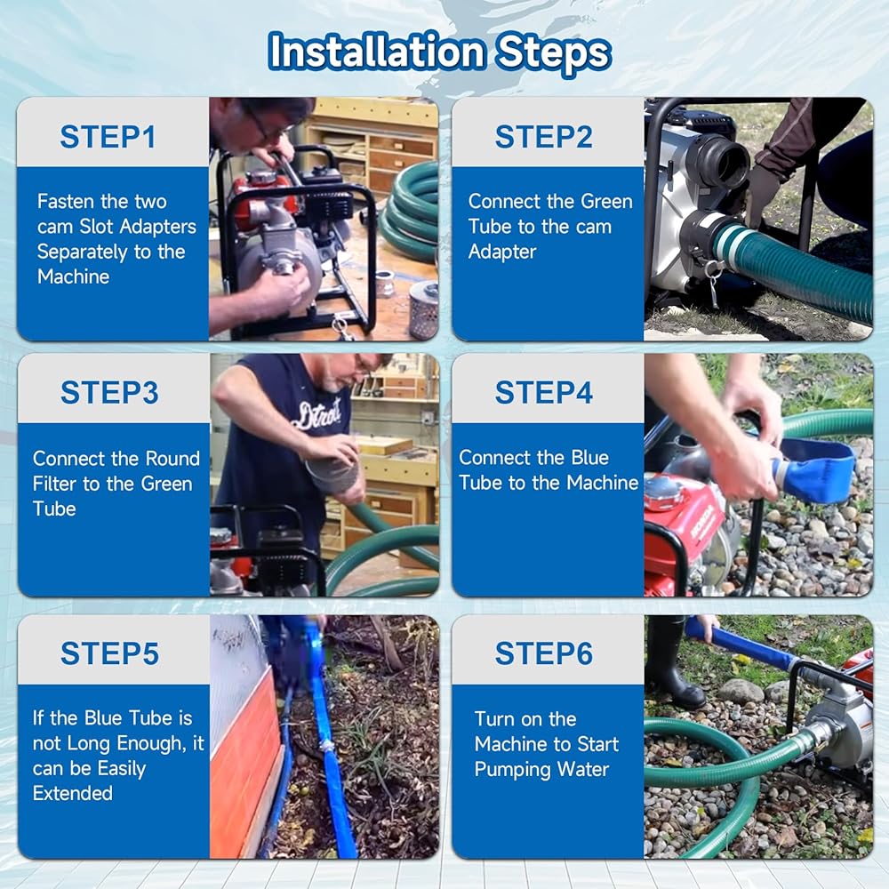 【Suction Hose Kit]】 Contains 3”×20ft green PVC suction hose, 3-inch x 65-ft blue PVC backwash hose, filter*1, cam and groove adapters*2, suitable for various types of pipes.