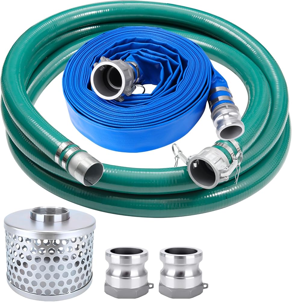 1 1/2 Inch Suction Hose Pump Kit for Water/Trash Pump Includes 1.5" X 65ft Blue Discharge Hose & 1.5" X 20ft Green Pvc Suction Hose & Aluminum Round Hole Suction Strainer, Cam And Groove Adapter