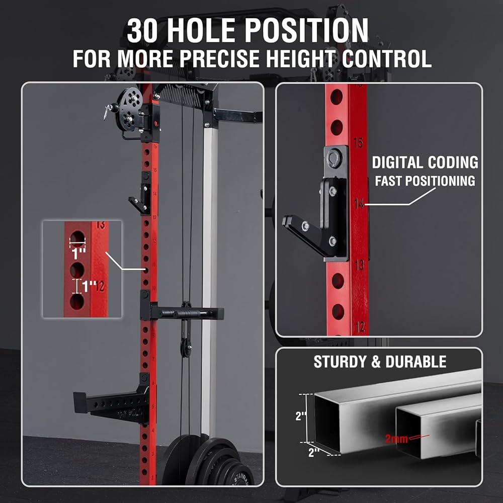 [Independent Dual Pulley System] Unlike the common power cage, the HR05 has an independent 1:1 ratio double pulley system on both sides of the frame. The 1:1 ratio means that the weight you train is the weight you load. And the weight capacity of the power rack will double. The independent pulley system allows you to complete supersets, drop sets, co-training, and other gym workouts without being limited by the home gym weight stack capacity.