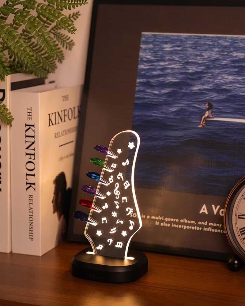 Featuring a guitar headstock design with musical symbols that come alive under soft LED glow, transforming ordinary picks into a stunning decorative piece