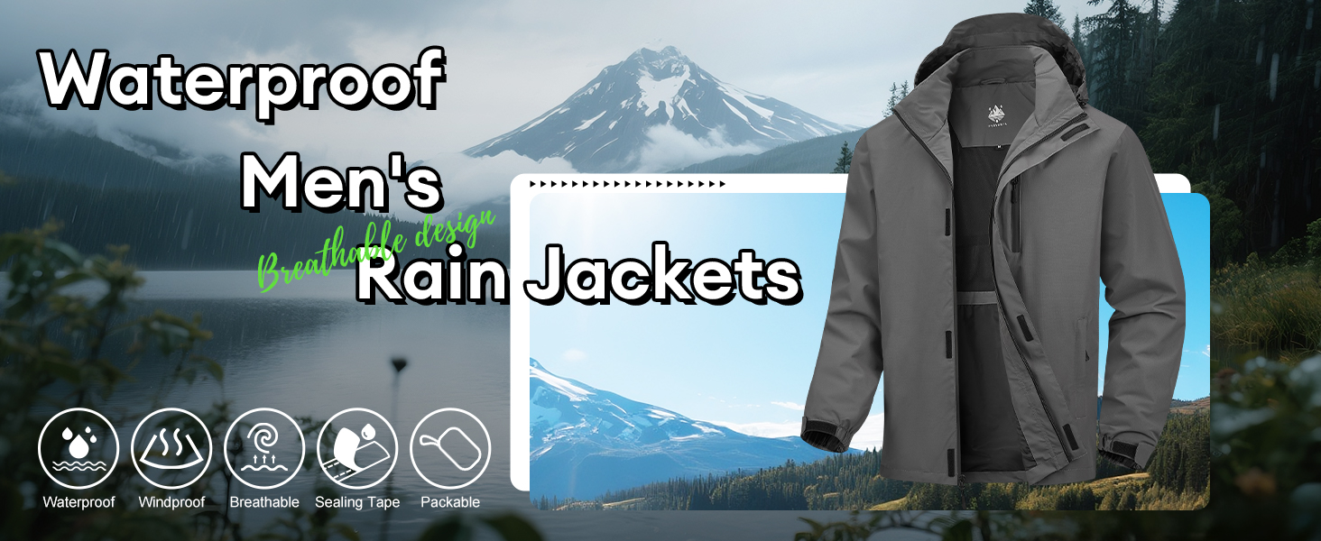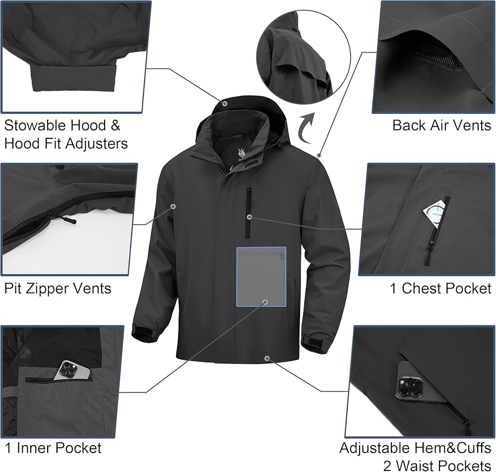 【Breathable】The men's waterproof rain jacket offers excellent breathability thanks to its 5000g/m²/24hr fabric. It incorporates a Back Air Vent and Pit Zipper Vents, ensuring superior ventilation during activities like cycling, hiking, golf, and running.