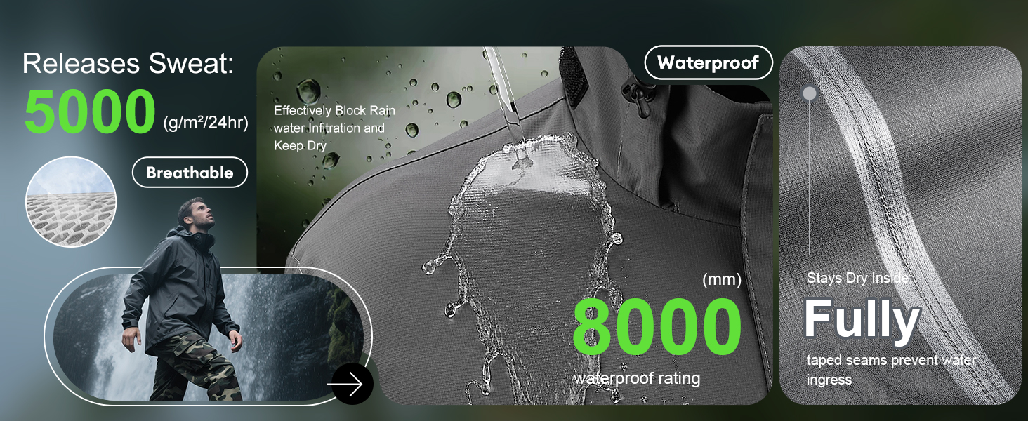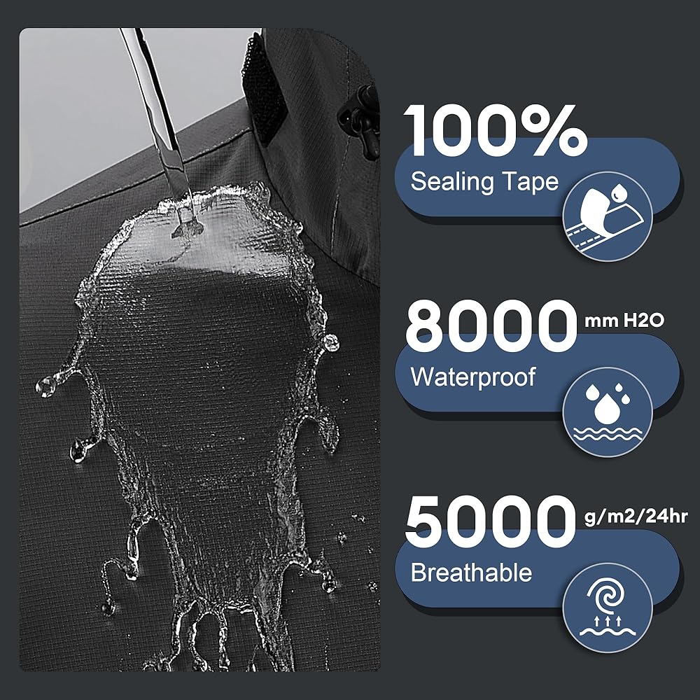 【Waterproof】The waterproof jacket features high-density polyester waterproof fabric with an 8000mm waterproof rating. Its inner layer is laminated with a TPU membrane, and features 100% fully sealed seams. Equipped with rainproof zippers and a front placket hook-and-loop wind flap, it keeps you dry in any storm.