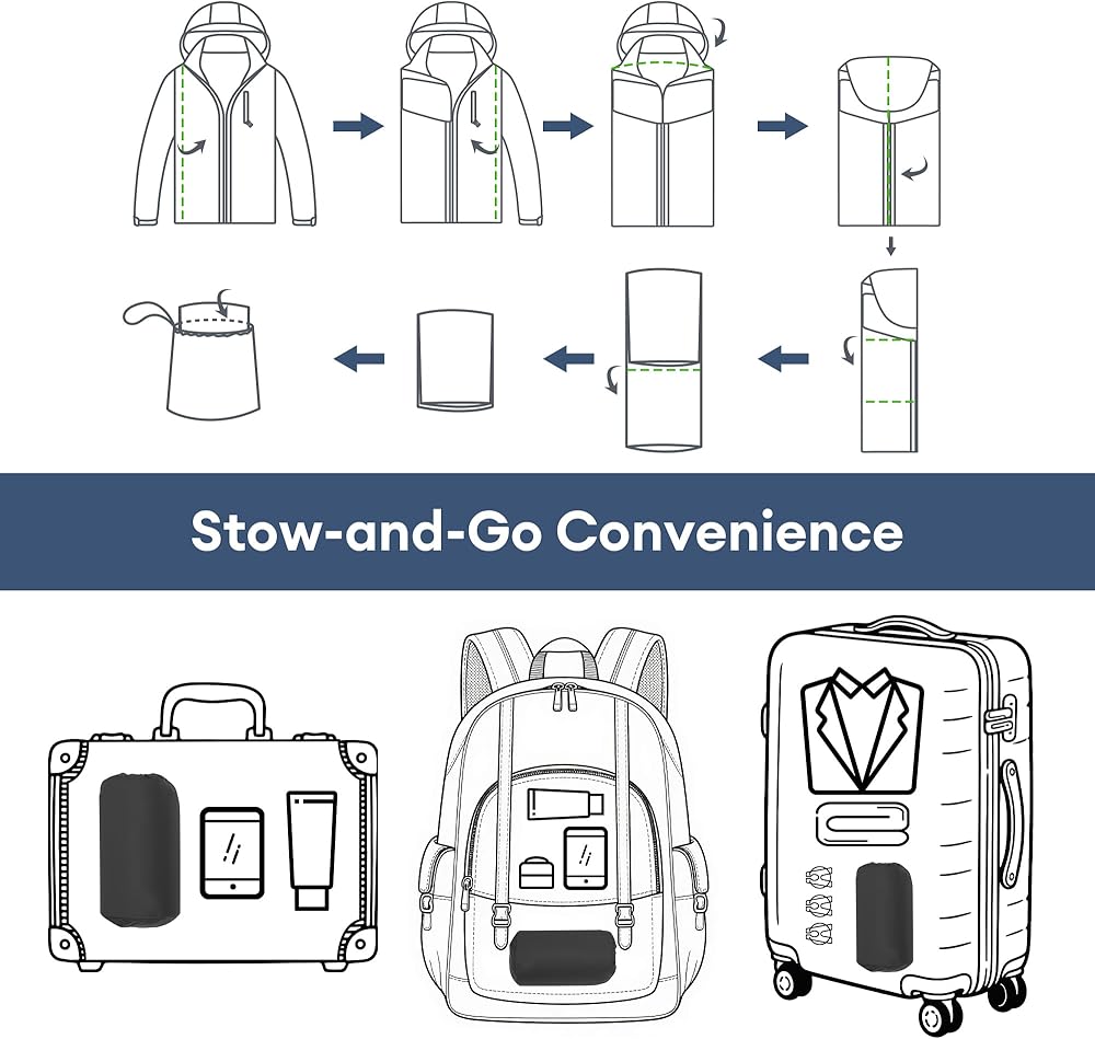 【Packable】This lightweight waterproof windbreaker comes with a packable carrying pouchp, allowing it to be easily packed into a handbag, travel bag, or suitcase for convenient portability.