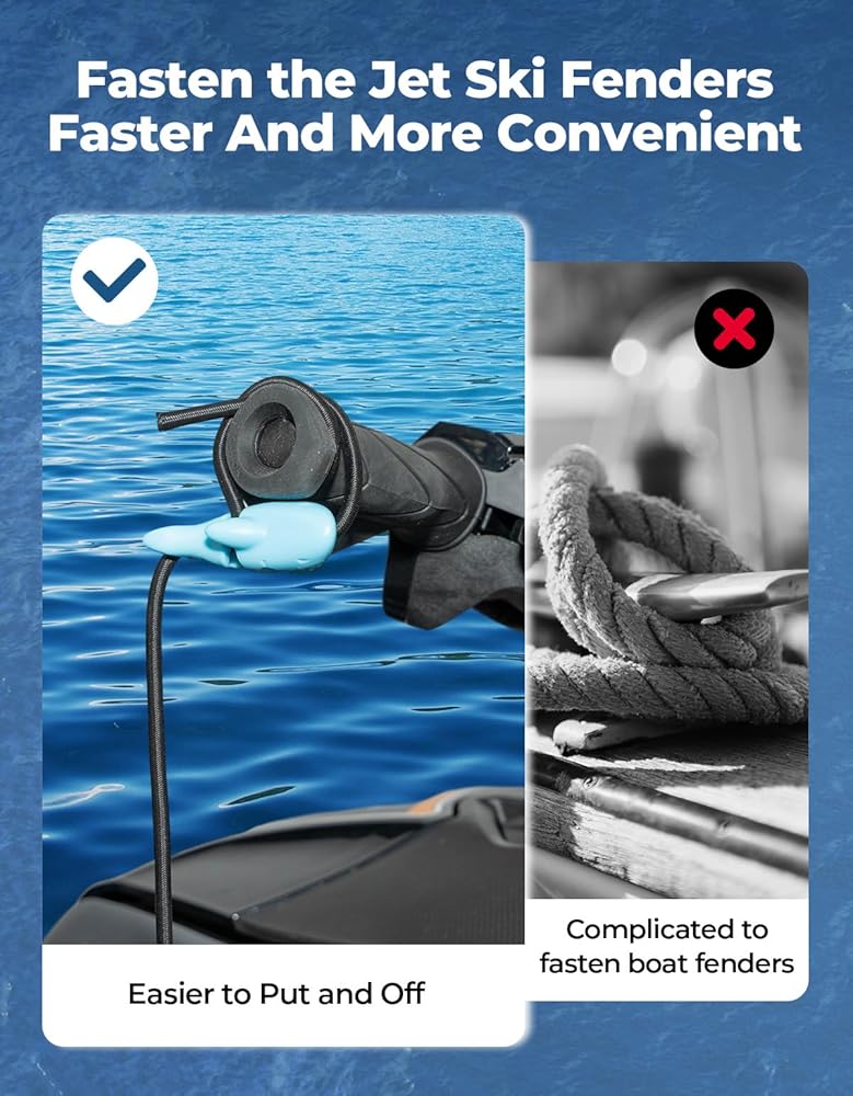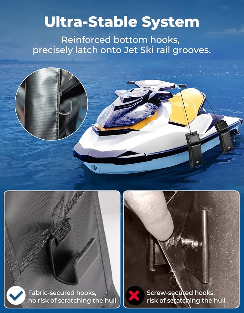 Ultra-Stable Secure Attachment: Reinforced bottom hooks latch securely into jet ski rail grooves, while pre-stretched bungee cords keep fenders tightly in place, even in rough waters