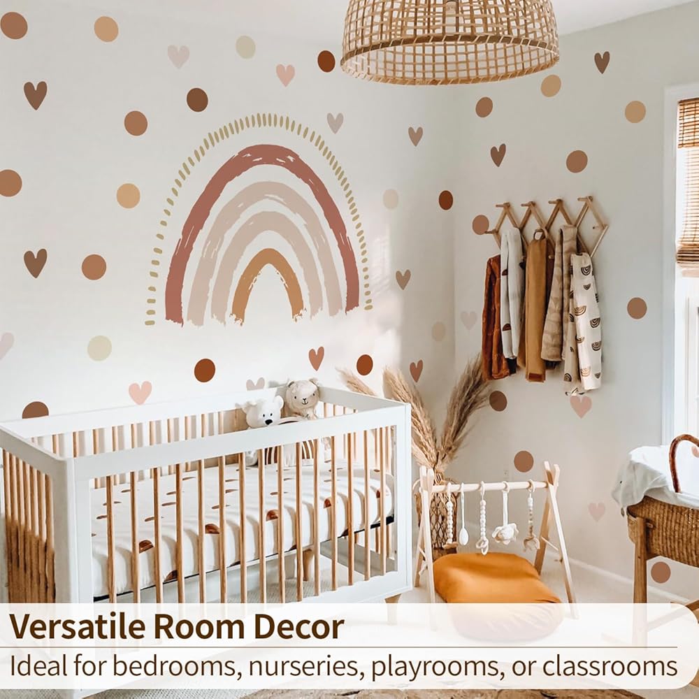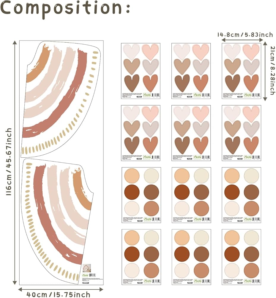 Come with 1 large boho rainbow (cut it into 2 halves), 36 pcs boho heart wall decals, and 36 pcs boho polka dots wall decals