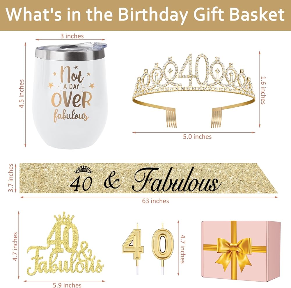 40th Birthday Gifts Women with 12oz Tumbler/Mug for Wine or Coffee, Birthday Crown, Sash, Cake Topper and Candles, 40 Year Old Decorations Gifts Idea Gold White