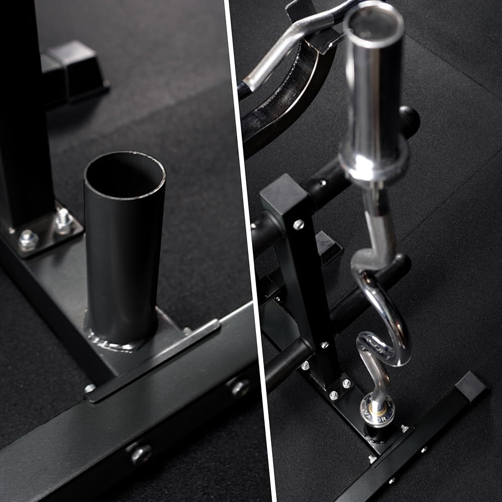 EZ BAR CURL STAND- This plate tree doubles as a heavy-duty arm curl station, giving you a multi-functional unit for your home gym. With the vertical barbell holder at the rear, you can easily store your curl bar when you complete your bicep workout.