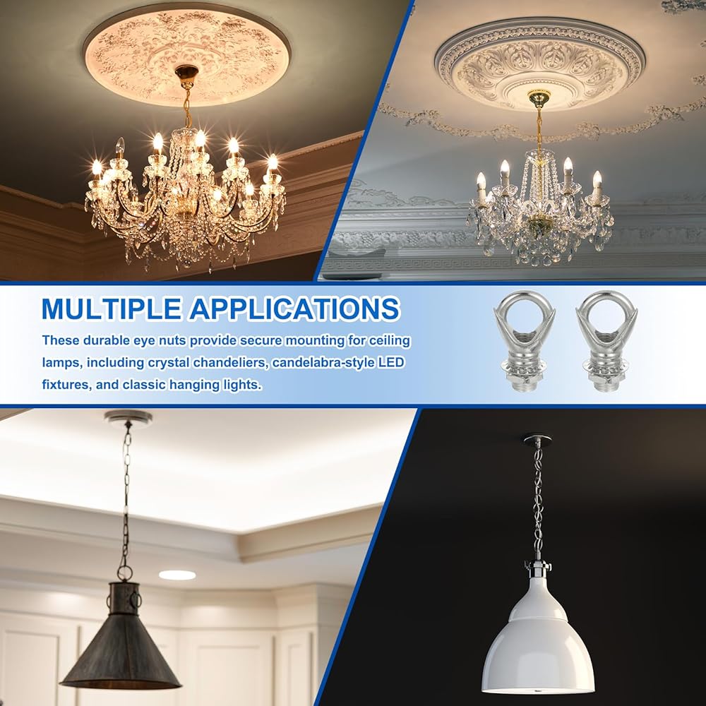 These eye nuts can fasten and hold the ceiling lamp. Suitable for kinds of chandeliers like crystal light, candelabra LED light, traditional hanging lamps, and so on. Widely used on your home, lounges, halls, dining rooms areas.