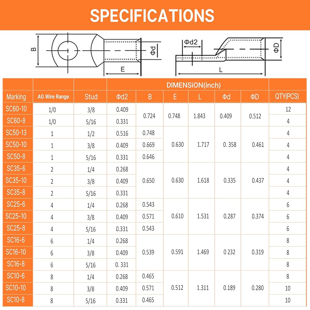 What You Get: Battery Cable Ends Kit with terminals for 1/0 and 2/0 AWG cables (3/8" & 5/16" bolt holes), plus 3:1 heat shrink tubing for secure insulation, suitable for high power devices such as car batteries