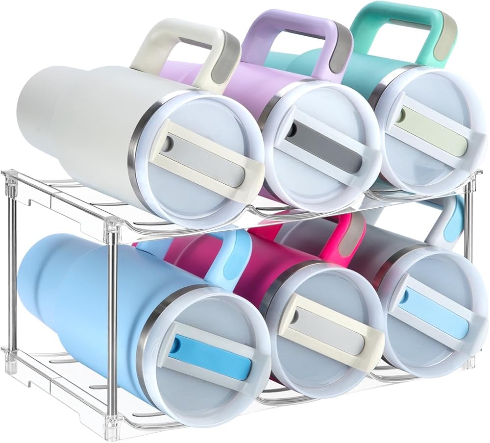 【STACKABLE & SPACING SAVING】This water bottle organizer can hold up to 3 bottles on each shelf. It features a stackable design, the 4-layer of cup holders can be tightly stacked together, maximizing space saving. The bottle storage rack makes water bottles easy to store and keeps your kitchen or cabinet space clean and tidy. 4 pack water bottle organizer perfect storage size: 11.49" x 8.1" x 13.59".