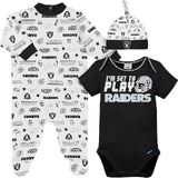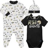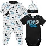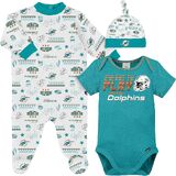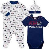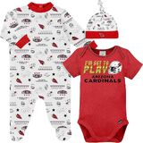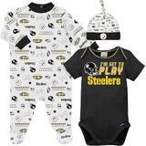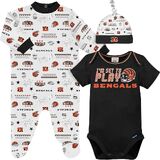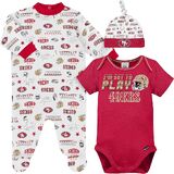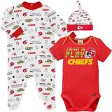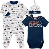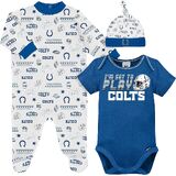 Show off baby's team pride with this 3-piece bodysuit, Footie, and cap set! This officially licensed NFL outfit is made with a soft cotton and polyester interlock to keep baby comfortable and content all game long. The bodysuit features an expandable lap shoulder neckline with high-positioned bottom snaps to keep changes quick and simple. It also has a screenprint team logo front and center. The footie boasts a colorful print of your team's logos and helmets and features inner thigh snaps with a back placket for comfort and convenience. The knotted cap features a soft cuff for comfort and will keep your little one snuggly warm in cool weather. This outfit is machine washable and dryable. It includes one bodysuit, one cap, and one footie.