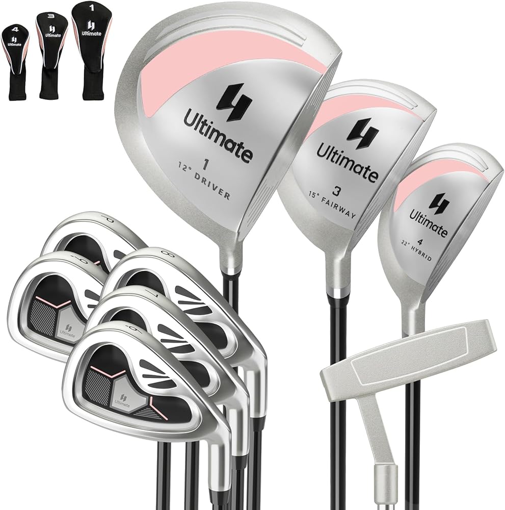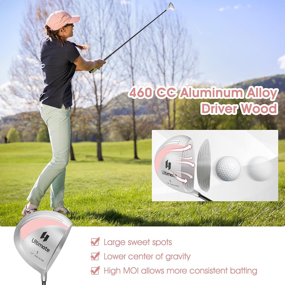 【Women's 9-Piece Complete Golf Clubs Set】ULTIMATE complete golf package set includes aluminium Driver, #3 Fairway Wood, #4 Hybrid, #6/#7/#8/#9/#PW Irons, Putter, Stand Cart Bag, 3 Head covers and Rain hood. Each club was designed to fit together for female beginning golfers and offer forgiveness, confidence and style.