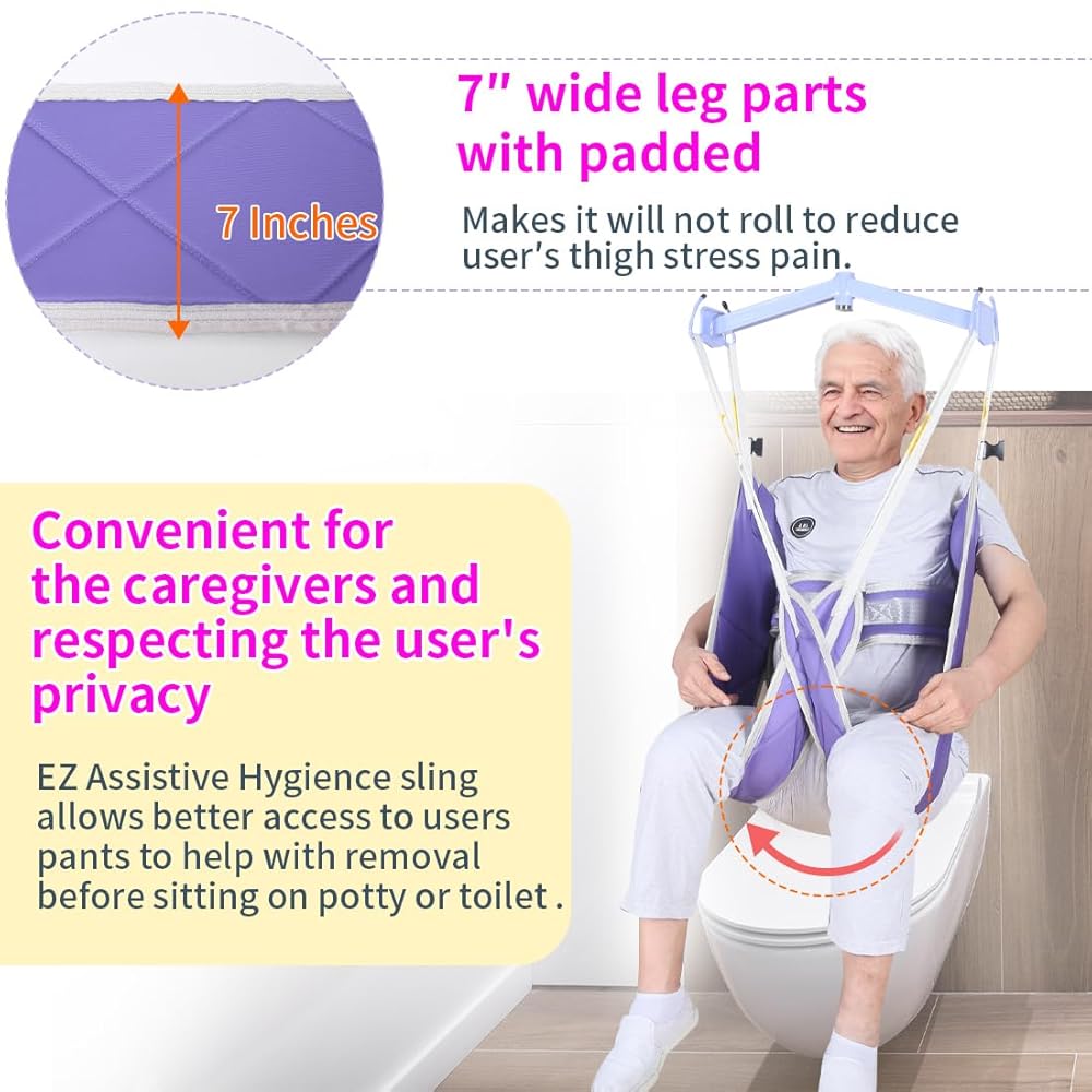 EZ Assistive commode patient lift sling is designed to assist elderly, disabled, or handicapped individuals during toileting, offering easy access to clothing while ensuring caregiver convenience and respecting the user's privacy.
