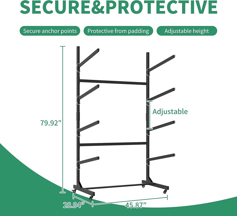 Stable & Secure Construction: Engineered with an extended base and reinforced crossbars, this kayak rack for garage and outdoor use provides unmatched stability. Its taller design accommodates larger kayaks while keeping them safe from tipping or damage, making it a reliable kayak stand outdoor.