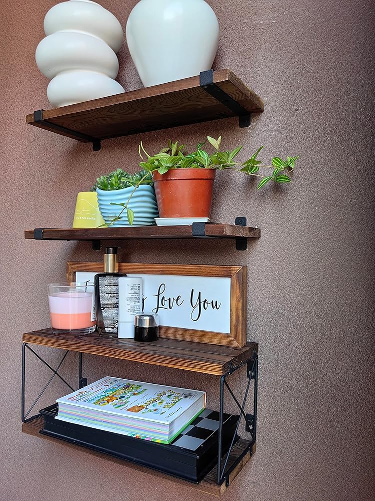 Included:2 Floating Shelves and X-shape brackets. X-shape brackets can store 3 rolls of toilet paper, other small objects, and towels. Our X-shape brackets of bathroom floating shelves is made of wire with a powder coated finish for a rust-free.You can get more space to display your plants, photos, books, and trophies for your wall decorations.