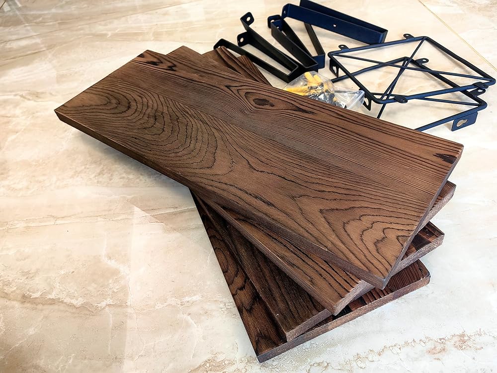 Natural Wood & Wall Mounted Design - Crafted from sustainably sourced Pinewood, our bathroom floating shelves exhibit the distinctive and exquisite grain patterns and colors inherent to each individual piece. Employing a meticulous charcoal roasting process, we restore the wood's inherent carbonized color and texture, enhancing its natural beauty. Our wall-mounted bathroom floating shelves maximize space utilization, adding a charming touch to your room and bathroom