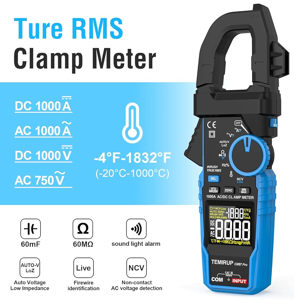 【CUSTOMER SERVICE】TEMIRUP provides 24 months after-sale service and technical support, 7/24 customer service. If the clamp meter is damaged within 24 months of purchase,just contact us and we replace it! Package includes clamp multimeter, test leads, thermocouple, screwdriver, multimeter hard case, batteries and user manual