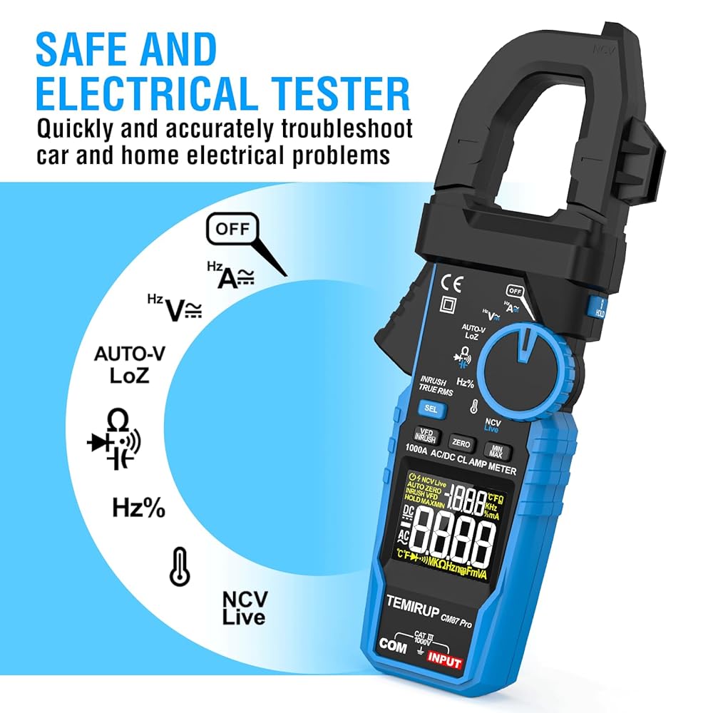 【TRUE-RMS 6000 COUNT CLAMP METER】This CM87B multimeter can accurately measure AC current, AC/DC voltage, temperature (thermocouple included), NCV, capacitance, resistance, frequency, continuity and diode. Good help for troubleshooting the household solar system, automotive and industrial electrical issues, perfect for electricians, DIY, professionals, etc