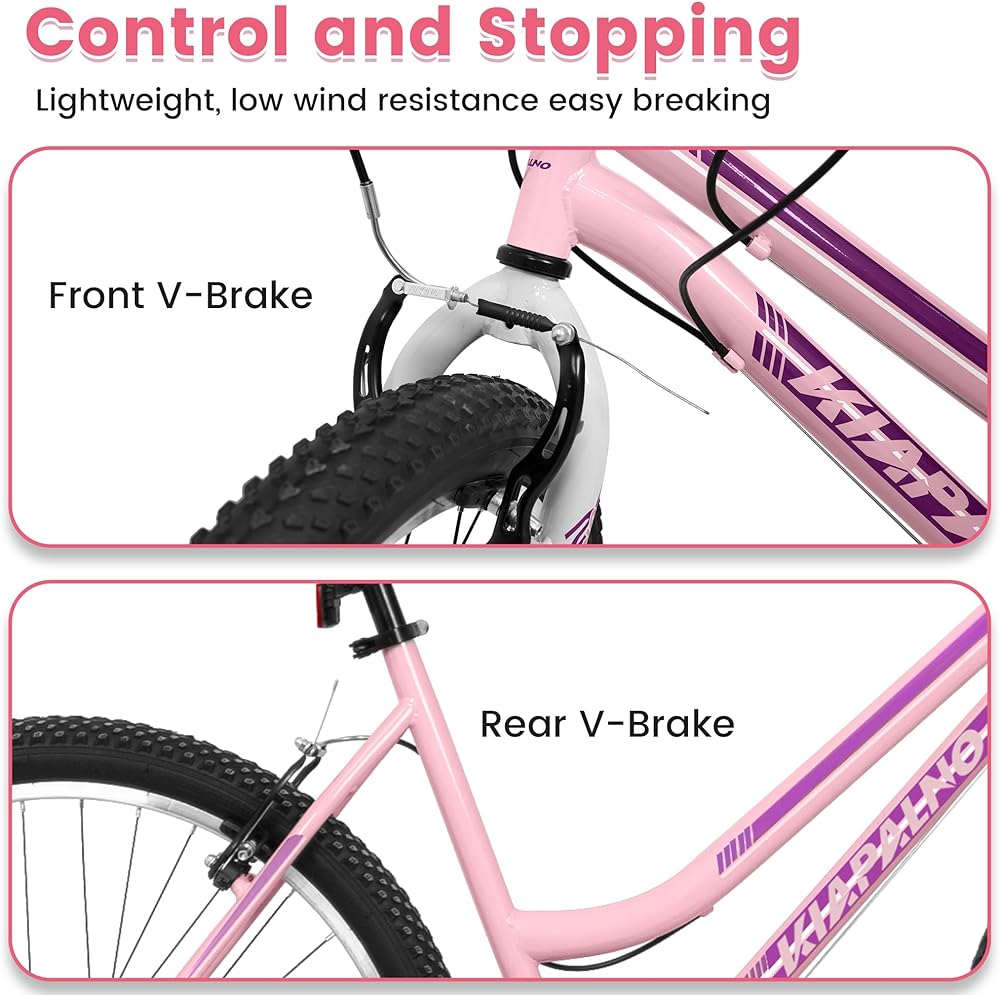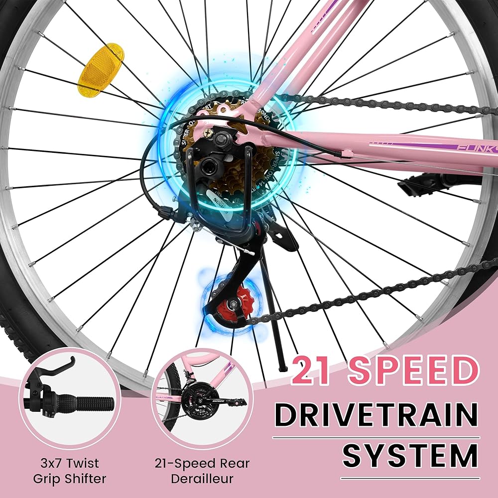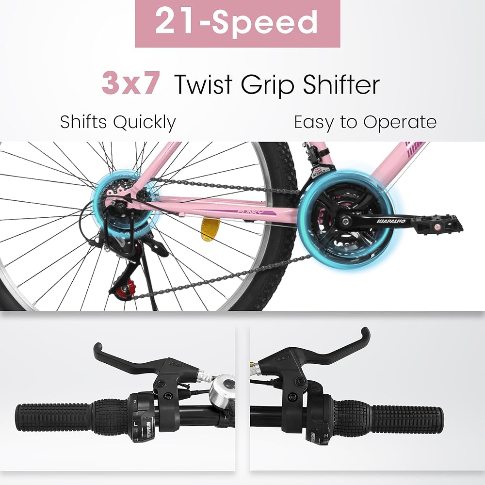 【21-Speed with V-Brakes】The twist Grip Shifter is easy to operate and allows you to quickly shift gears while riding different terrains. The brakes are V-brakes, which are sensitive and easy to maintain.